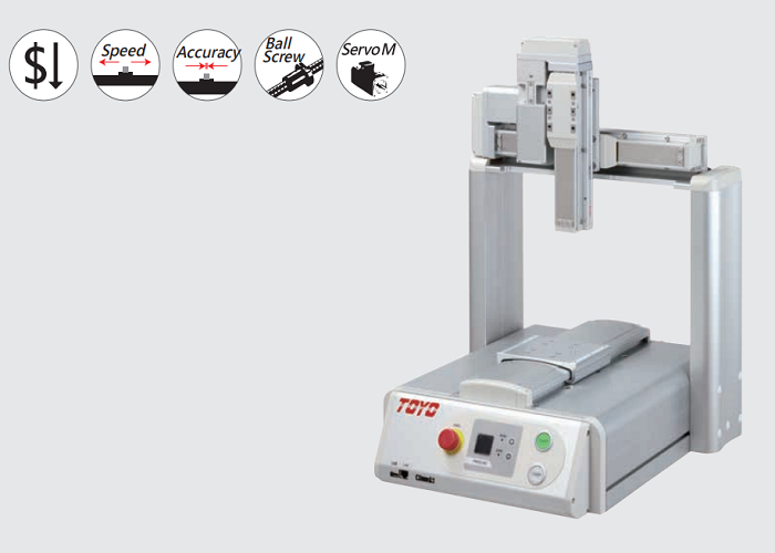 TOYO365英国上市桌上型机械手高精度、使用方便、结合专业开发之TOYO FSE软件做点胶机功能,使点胶涂布功能更加丰富。内建CAD转路径功能,可使教导更快,搭配CCD和Laser可以进行XYZ坐标补正,可做到路径的位置连续补偿。可应用于点胶、銲锡、视觉检测、精密对位等场合。
